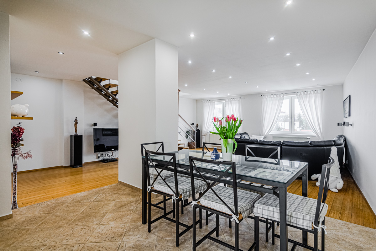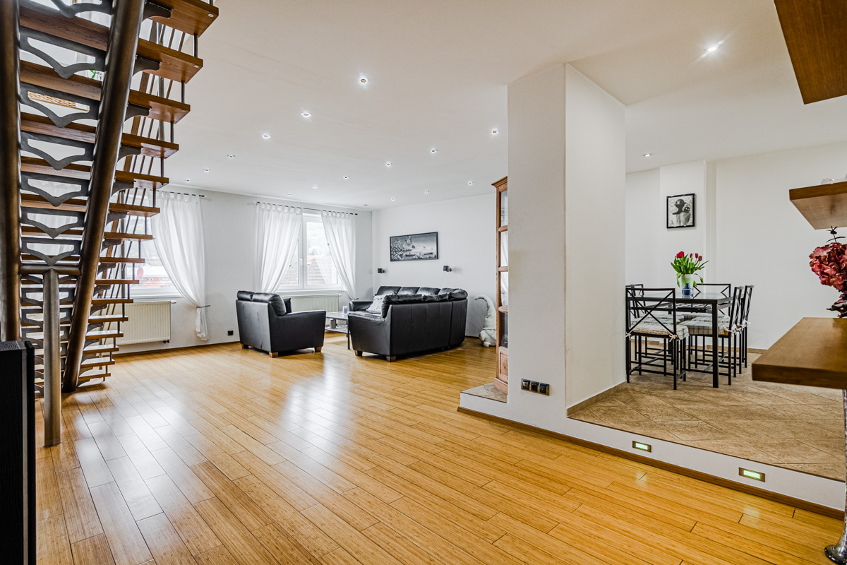 V žádané lokalitě na Praze 5 – Hlubočepy nabízíme k dlouhodobému pronájmu velmi atypický prostorný mezonetový půdní byt s nádherným výhledem na Prokopské údolí s úžasnými scenériemi Barrandovského skalního masívu. Byt 4+k s jídelnou o celkové rozloze 235m2 se zimní zahradou 30m2terasou 20m2 se nachází ve 3p. bez výtahu. Při vstupu do bytu vcházíte do prostorné chodby kde se nachází vstup na terasu, koupelnu s rohovou vanou, samostatné. V horním patře pak najdete 3 samostatné pokoje , koupelnu se sprchovým koutem, WC a bidet, zimní zahradu – majitel tuto místnost využíval jako fitness, dále pak spoustu úložného prostoru – vest.skříně tak i ve dvou pokojích. Dominantou celého bytu je velice pěkný prostorný obývací pokoj, který je propojen s jídelnou a kuchyní z které vcházíte na terasu. V bytě může zůstat veškeré vybavení, které jsou na fotografiích včetně spotřebičů jako je i pračka se sušičkou, lednice. Možnost pronajmout i venkovní parkovací stání, které je pod uzavřením. Vytápění a ohřev vody zajišťuje elektrický kotel s boilerem. Z hlediska občanské vybavenosti má okolí též co nabídnout. V okolí se nachází několik mateřských a základních škol, poliklinika, pošta. Najdeme i zde různé supermarkety, restaurace, aquapark nebo také mnoho sportovních a areálů. Na své si přijdou milovníci turistiky a cyklistiky, prakticky téměř od domu můžete vyrazit na procházku do Prokopského údolí. Vzhledem k lokalitě tuto nabídku doporučujeme. Nutno vidět. K nastěhování od 1.9 - prohlídky možné ihned.